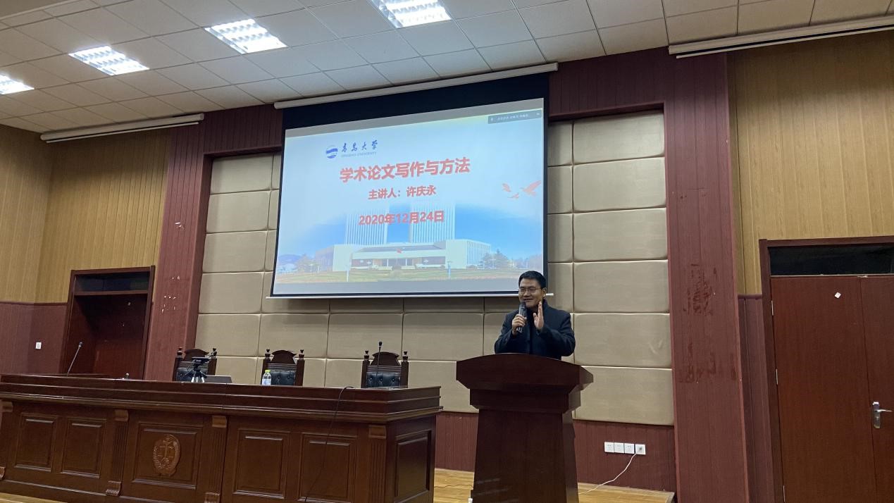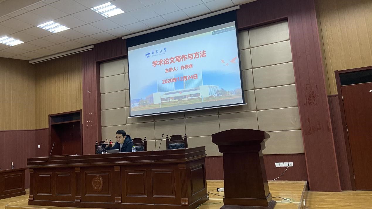 副教授许庆永在笃行楼模拟法庭报告厅为学院研究生带来了主题为“学术论文写作与方法”的专题报告会,本次报告会由19级国际法研究生樊馥嘉担任主持人,吃瓜网