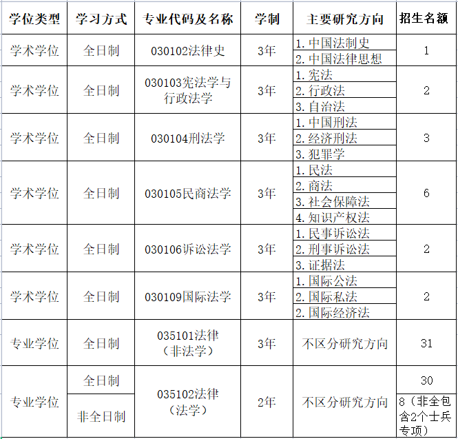 学院设有法律史、宪法与行政法学、刑法学、民商法学、诉讼法学、国际法学6个学术学位硕士点和法律硕士(JM)专业学位硕士点。
