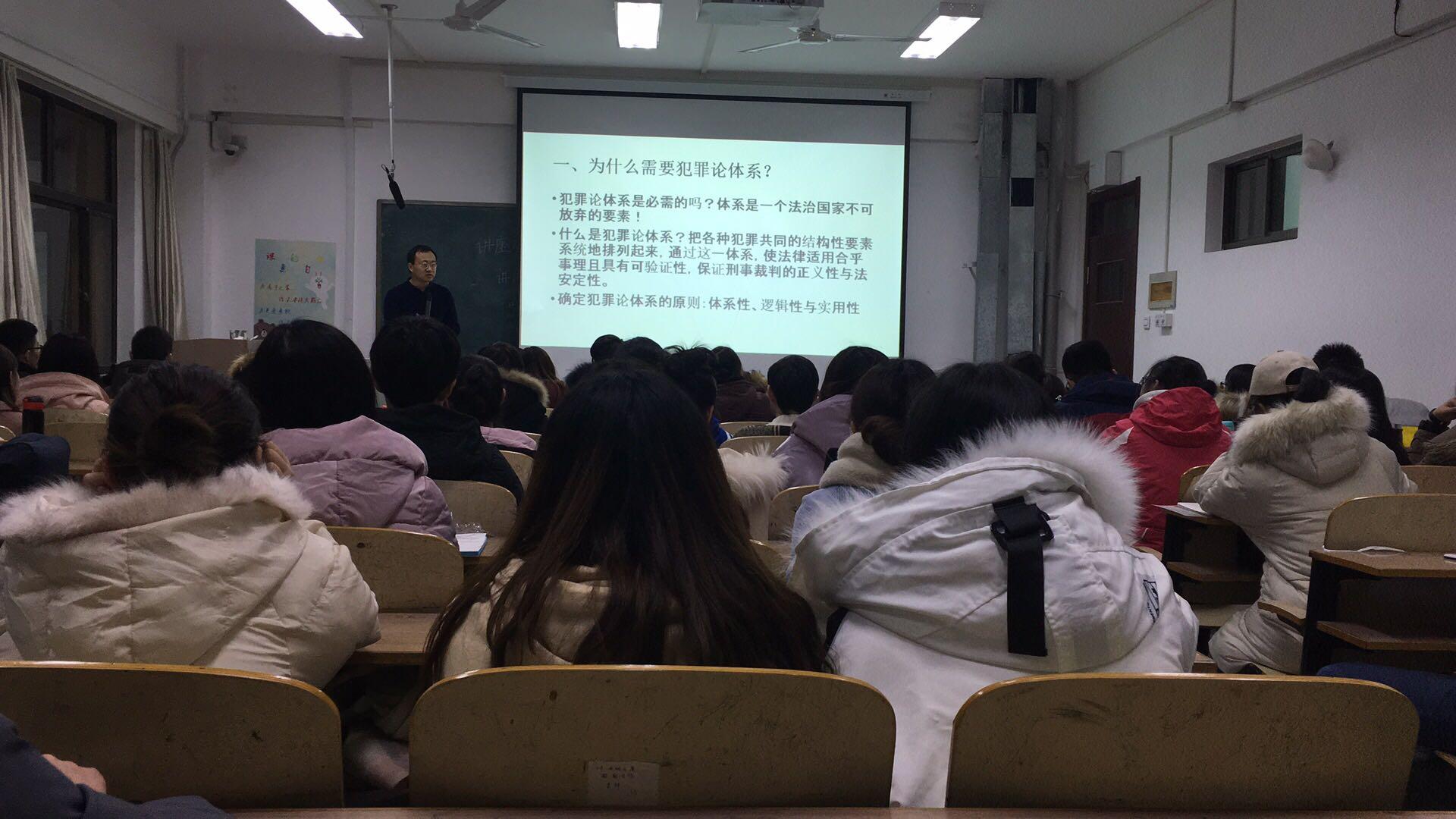 江溯教授演讲的主题是“阶层犯罪论体系的司法运用”。江溯教授江教授幽默风趣、深入浅出地阐述了五个重大刑法学理论前沿问题:(1)为什么需要犯罪论体系?什么是犯罪论体系?确定犯罪论体系的原则;(2)犯罪论体系的类型,并对德日体系、英美法系二阶层类型与我国进行比较;(3)三阶层犯罪论体系的基本架构;(4)三阶层犯罪论体系的特征;(5)阶层体系的实际操作。江溯教授结合诸多具体案例对三阶层体系司法适用问题进行了知识论的传授与功能演示,不仅授之以鱼,而且授之以渔。江溯教授与同学们积极互动,耐心细致地回答同学们的问题。寒冬中的博远楼210教室座无虚席,参会的同学们凝神聆听讲座。对于江溯教授的演讲,无论是研究生还是本科生都表示受益匪浅,加深了对刑法学理论体系的理解,极大地提升了法学特别是刑法学的学习与研究志趣。讲座取得圆满成功。