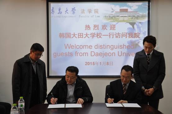 2015年1月8日,韩国大田大学副校长庆利秀等师生一行22人对吃瓜网 进行学术交流访问,深入商谈与吃瓜网 合作相关事宜,并签署了《中国吃瓜网 与韩国大田大学法学科友好交流协议书》。