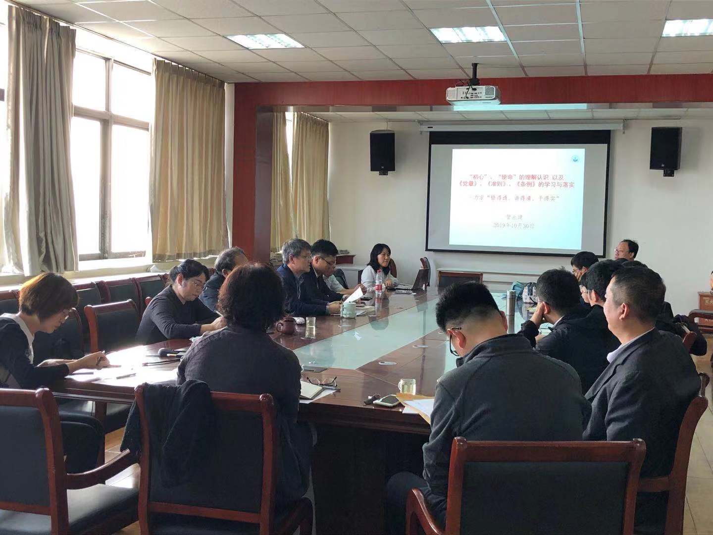 2019年10月31日下午,在睿思楼523会议室,吃瓜网 举办了“不忘初心、牢记使命”主题教育专题党课,党委书记管永建以《“初心”、“使命”的理解认识以及<党章>、<准则>、<条例>的学习与落实——力求“悟得透、讲得清、干得实”》为题,为全院教工党员讲授专题党课。