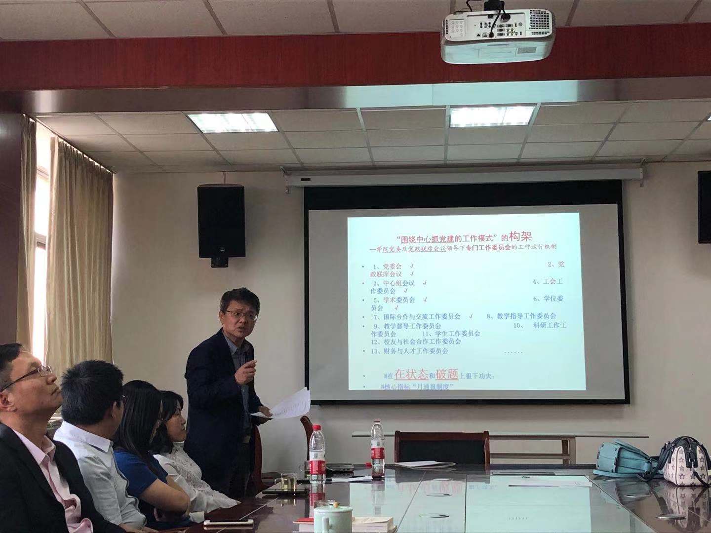 最后,管书记就近期校党委书记胡金焱来学院开展调研的讲话精神阐述了学院围绕中心工作搞党建的工作思路。他结合学院博士点申报、一流学科建设、第五轮学科评估,对学院的现状进行了分析和评述。他说,学院的中心工作就是人才培养。人才培养也是高校基层党建工作最大的初心、最大的使命、最大的政治。要建立“围绕中心抓党建的工作模式”的构架--学院党委及党政联席会议领导下专门工作委员会的工作运行机制,在“在状态”和“破题”上狠下功夫;调动一切积极因素,为中心工作服务。要按照“三全育人”开展全员育人、全过程育人、全方位育人活动。通过这次“不忘初心、牢记使命”主题教育,凝心聚力,团结合作,为学校和学院事业发展作出应有的贡献。
