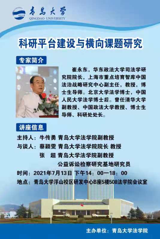 地址:青岛市宁夏路308号研发大楼B座6楼 邮编:266071 传真:(86)-532-85953085 学院信箱:faxueyuanzp@126.com 联系电话:(86)-532-85955910